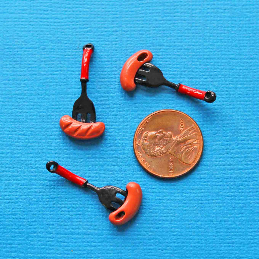Sausage on fork charms, in a zinc alloy metal and enamel.
