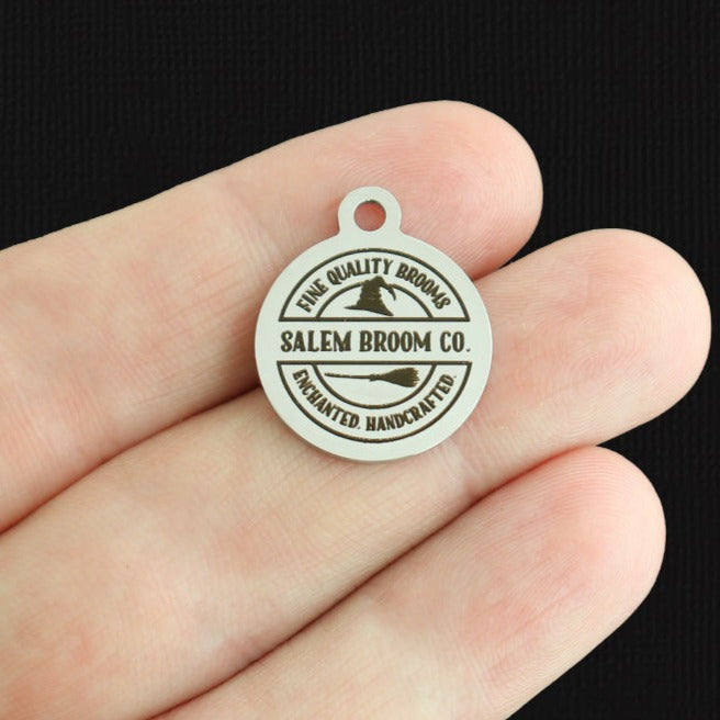 "Salem Broom Co. Fine Quality Brooms, Enchanted. Handcrafted." laser engraved stainless steel round charms with witch hat and broom image, from our exclusive line designed by Bohemian Findings.