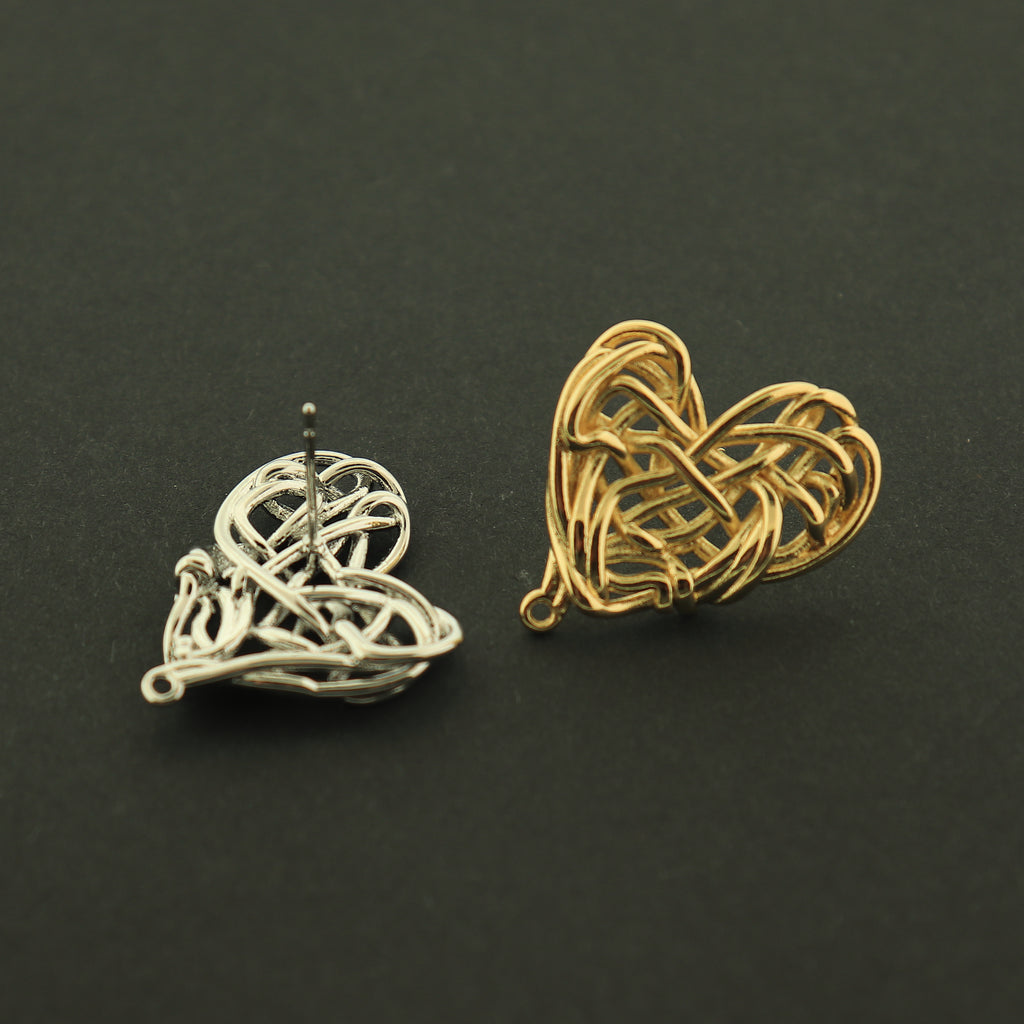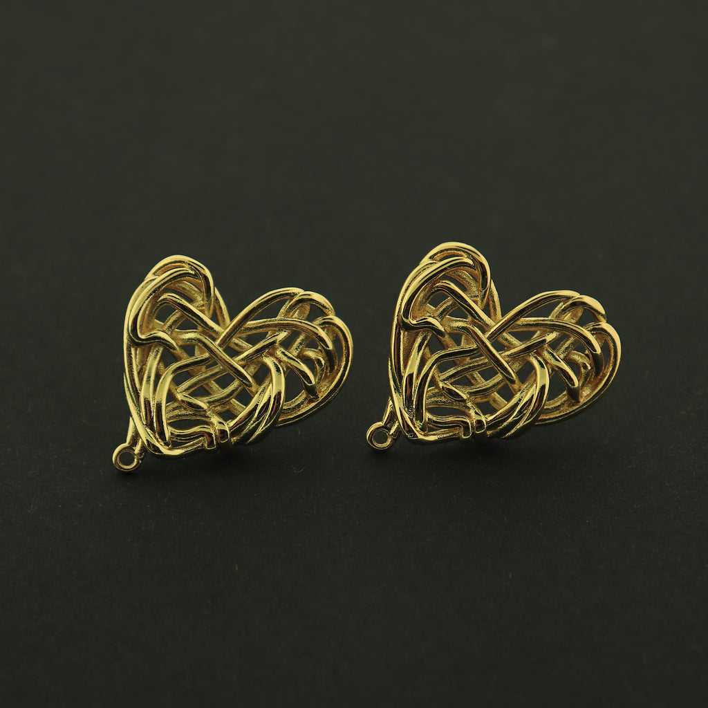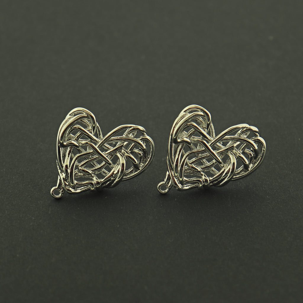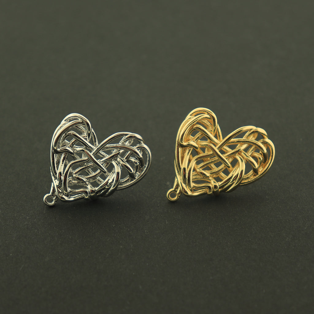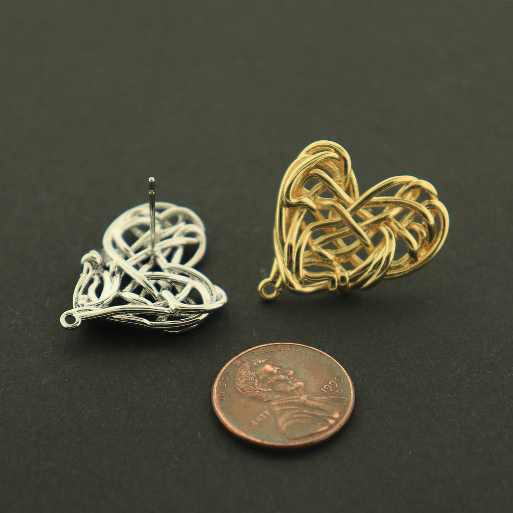14k gold plated or rhodium plated woven heart earring studs, the perfect base for your next earring creation! They are 14k gold plated copper.