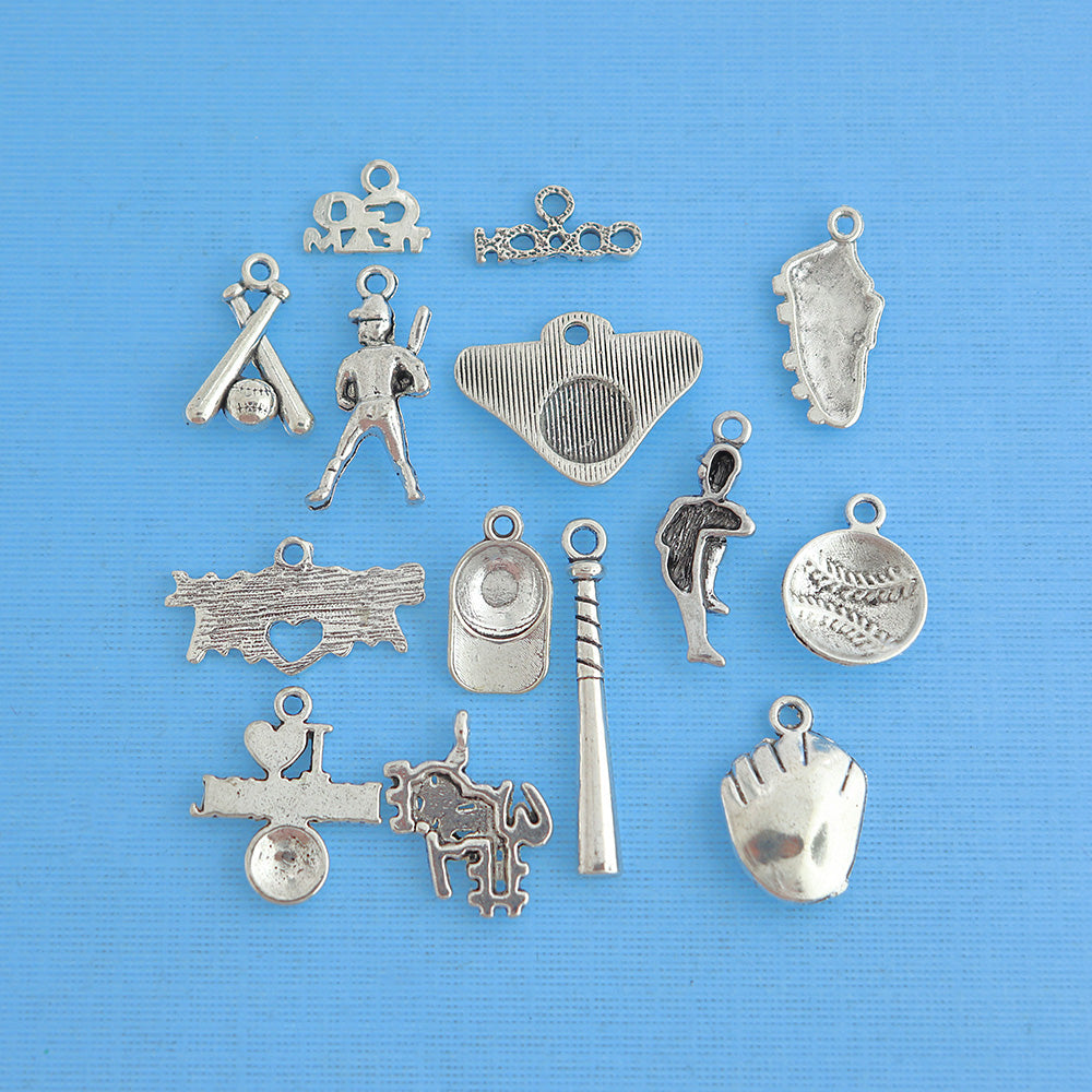 Baseball themed collection of antique silver tone charms, in a zinc alloy metal.