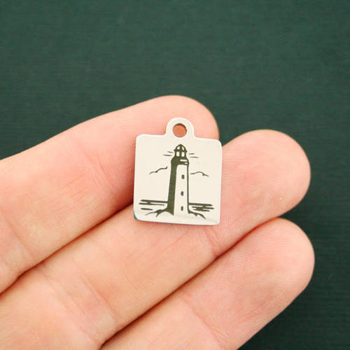 Light house image laser engraved stainless steel square charms, from our exclusive line designed by Bohemian Findings.