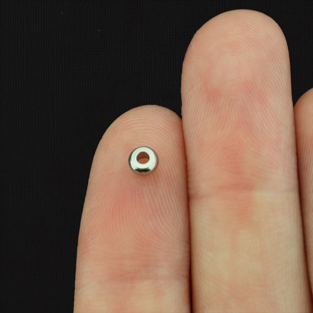 Silver tone 304 stainless steel metal beads in a 4mm spacer, with a metallic finish. They are lined with rubber, so they're also fabulous for creating adjustable clasps, and working with cord for eyeglass and mask lanyards!