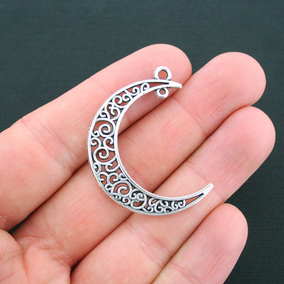 Crescent moon with two loops for connecting or adding a dangle charm in antique silver tone charms, in a zinc alloy metal.