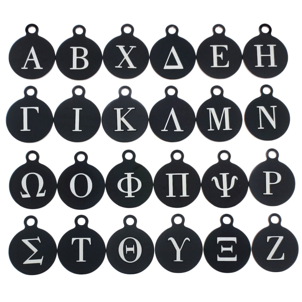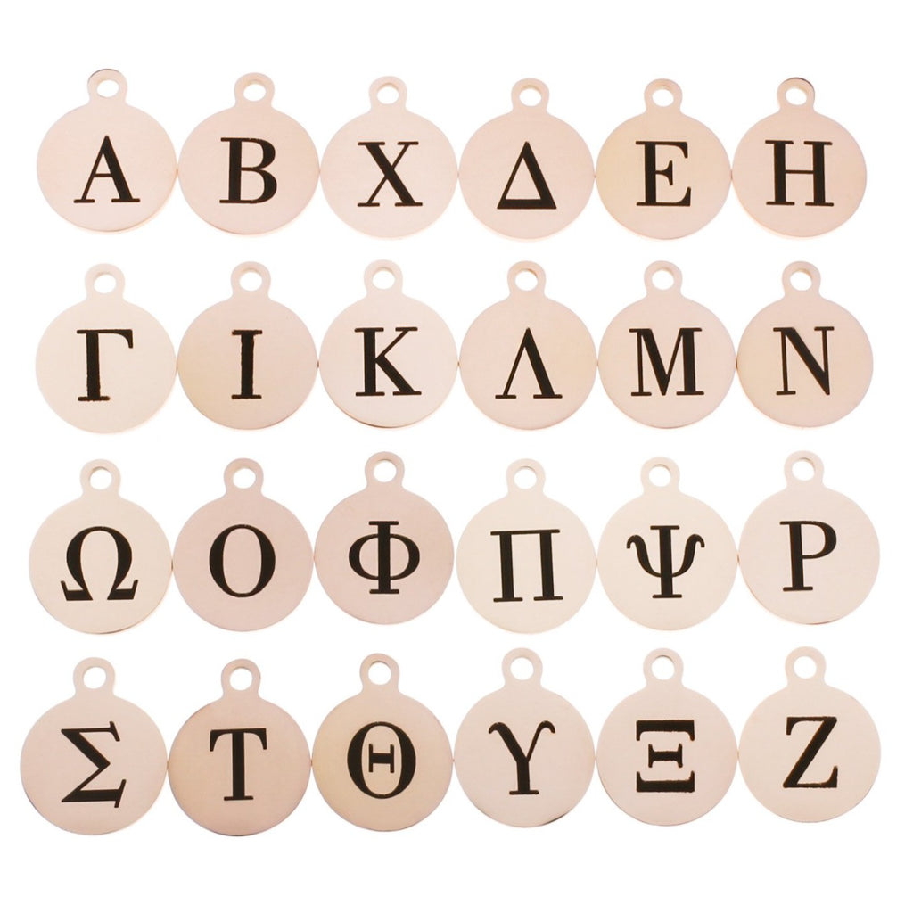 Check out these high quality stainless steel greek alphabet charms! This listing is full the full set of all 24 letters. Available in silver, gold, rose gold, black, blue, and rainbow tones!