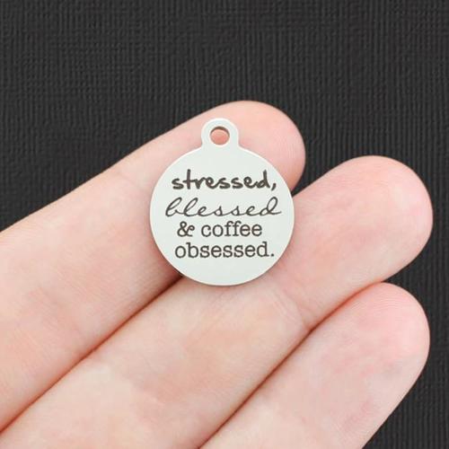 "Stressed, blessed, and coffee obsessed" laser engraved stainless steel round charms, from our exclusive line designed by Bohemian Findings.