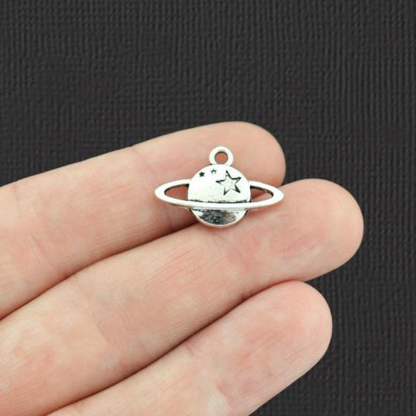 Planet with rings antique silver tone charms, in a zinc alloy.