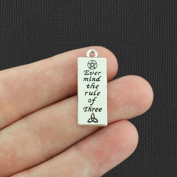 Wiccan "Ever mind the rule of three" tag with pentagram star and triquetra knot antique silver tone charms, in a zinc alloy.