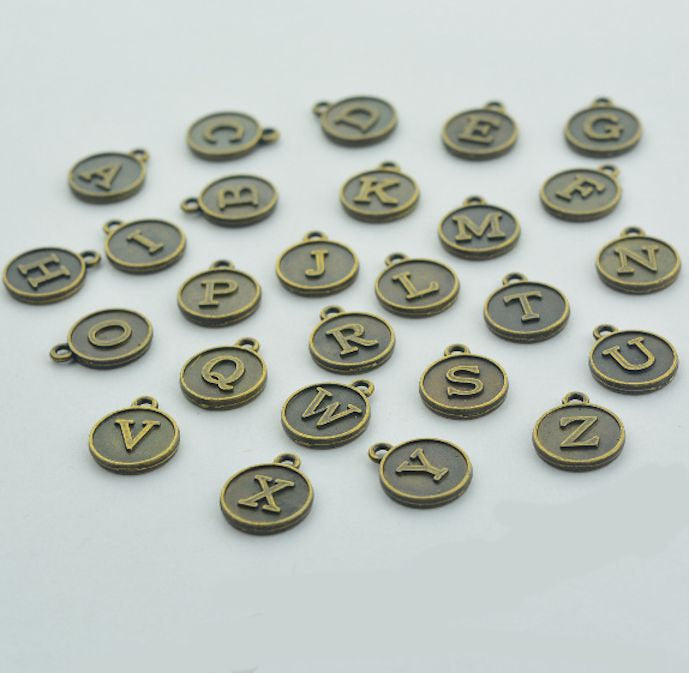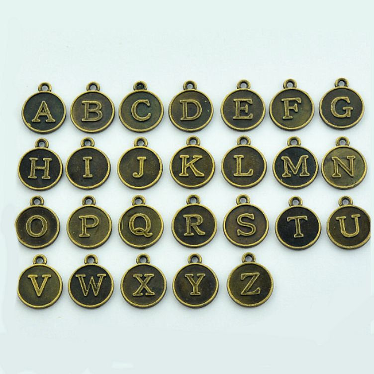 Full alphabet initial set bronze tone charms, in a zinc alloy metal.