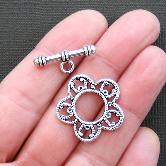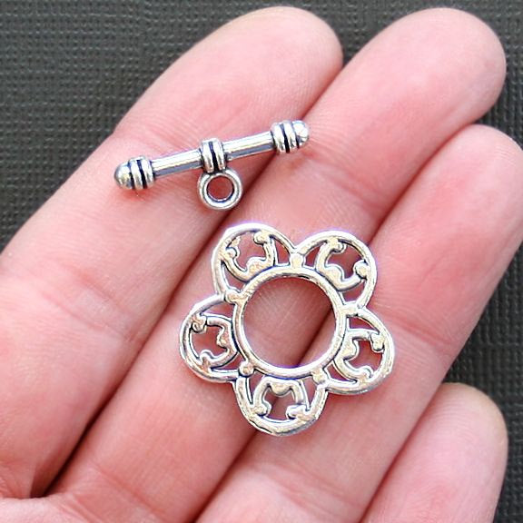 Flower toggle clasps silver tone, in a zinc alloy metal.