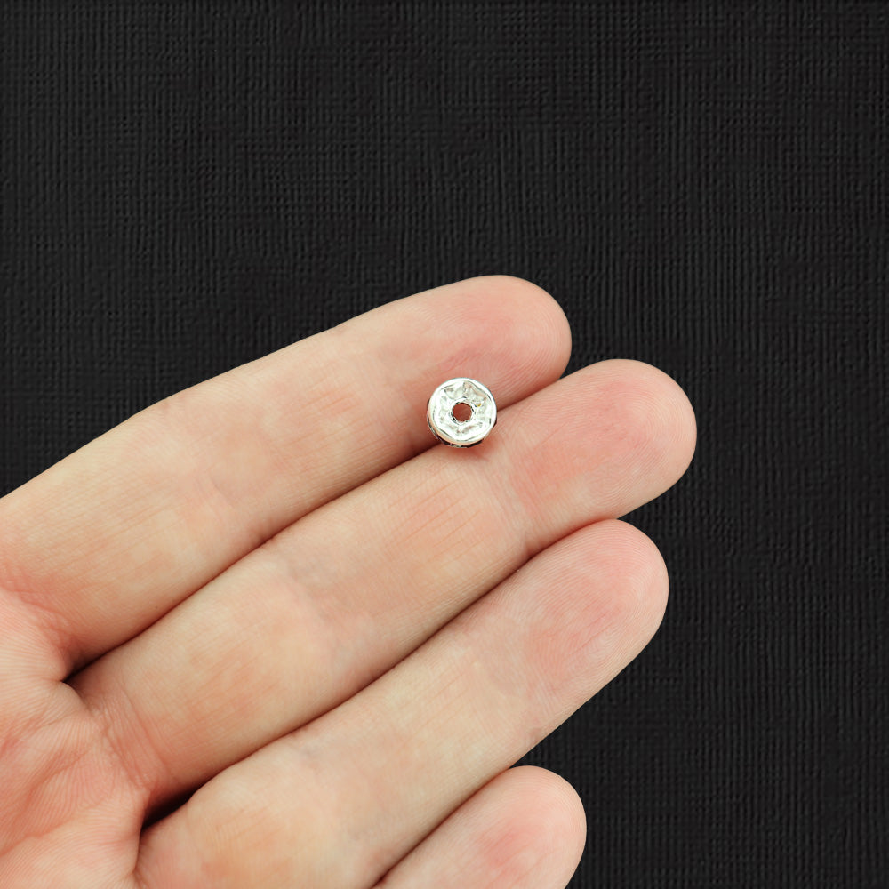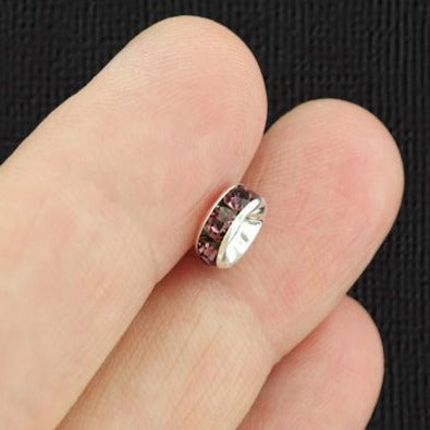 Silver tone zinc alloy metal beads in a 7mm x 3.3mm rondelle spacer, with a metallic finish with inset purple rhinestones.