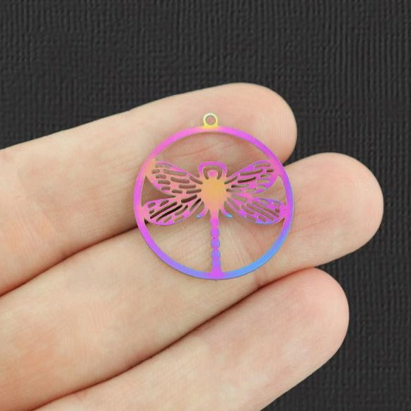 Dragonfly circle electroplated rainbow stainless steel charms.
