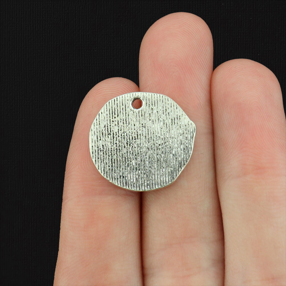 Heart design round disc antique silver tone charms, in a zinc alloy metal.