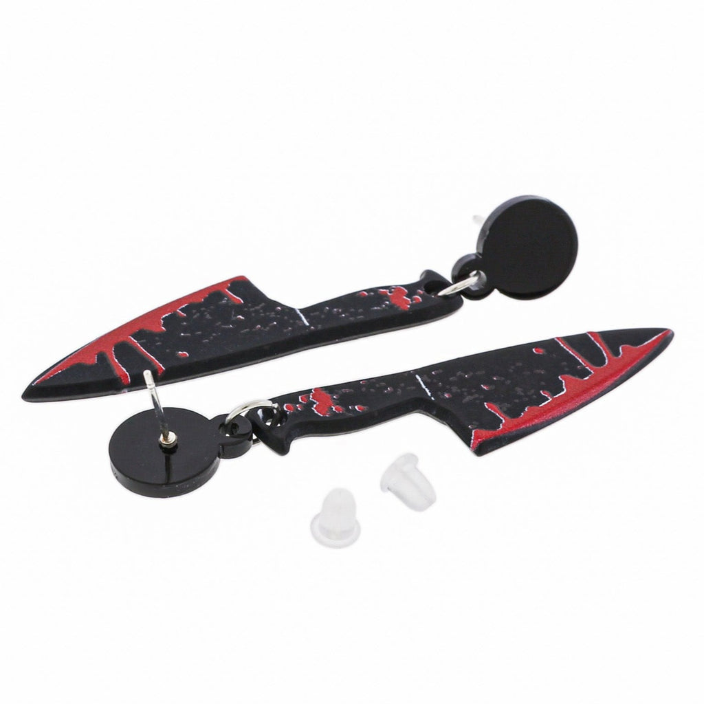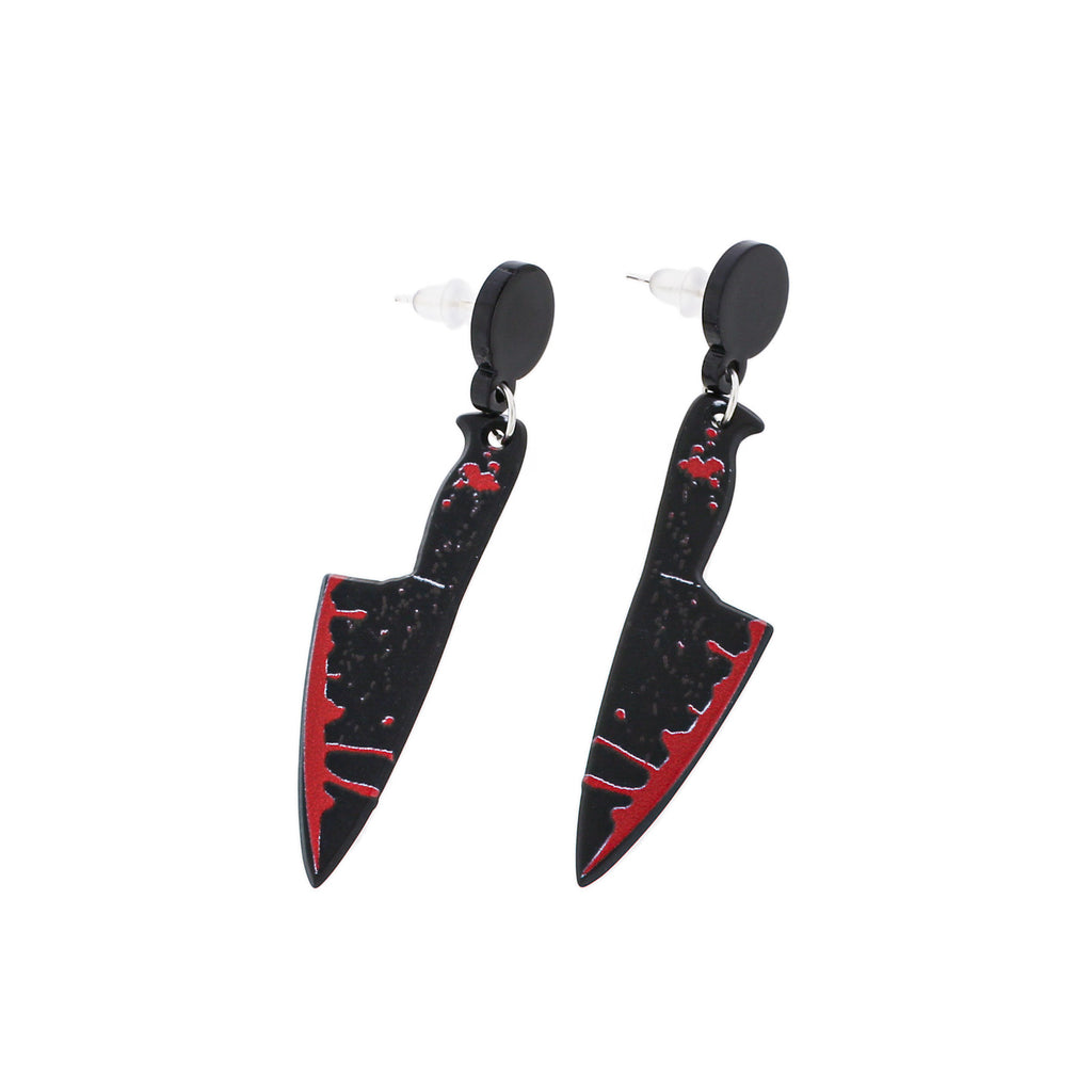 Silver tone earrings with acrylic bloody knife in zinc alloy metal. Perfect as a statement piece!