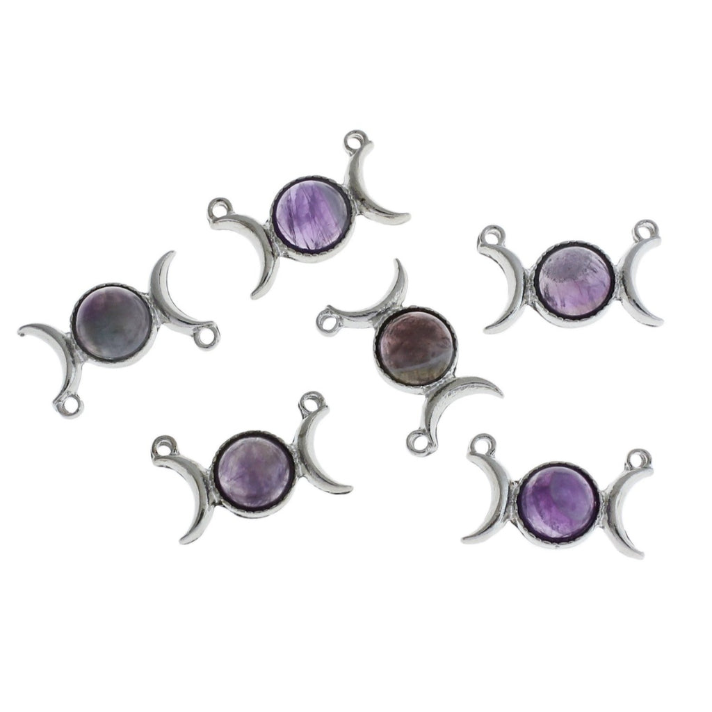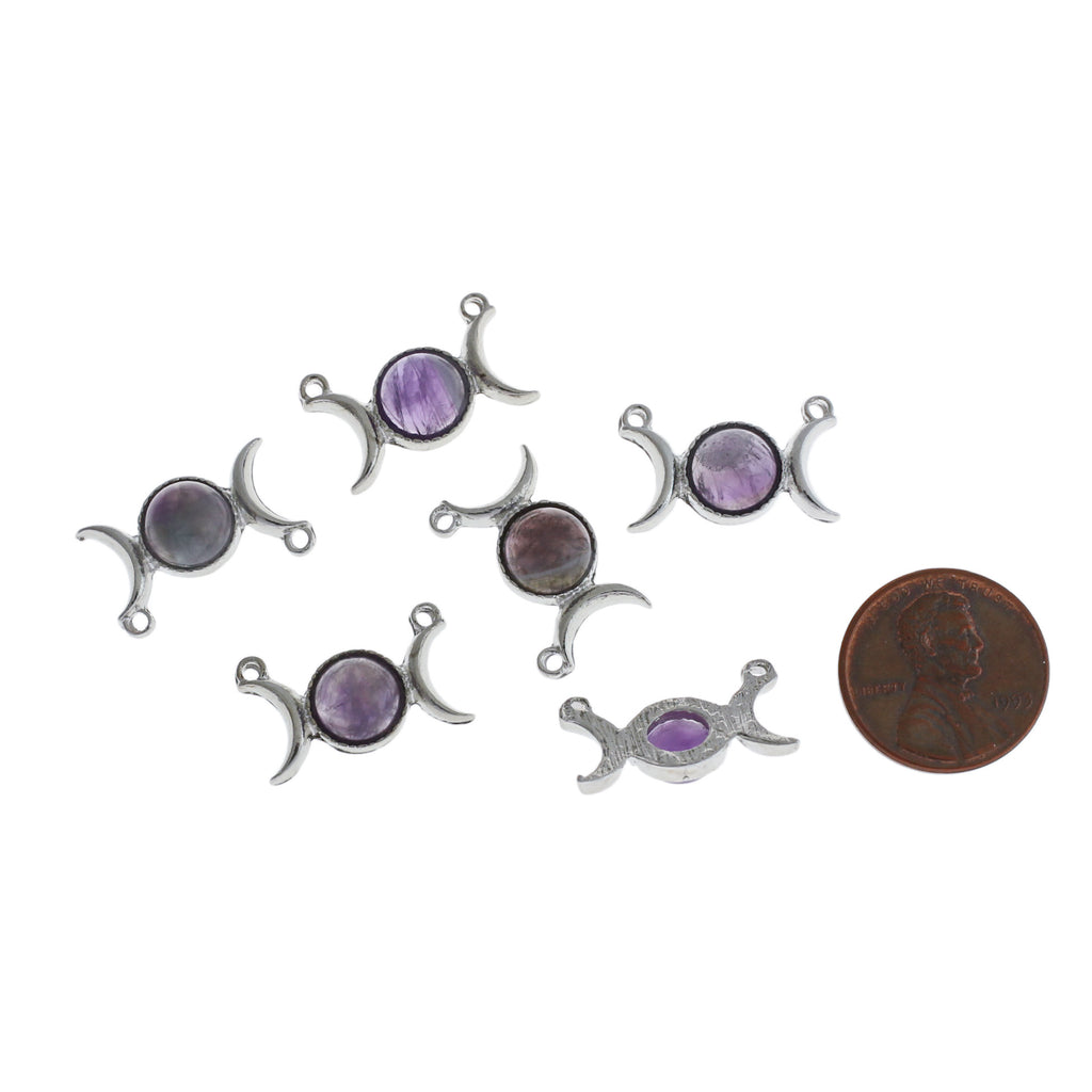 Double moon antique silver tone charm with natural amethyst gemstone, in a zinc alloy metal.