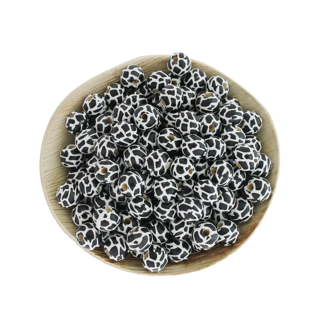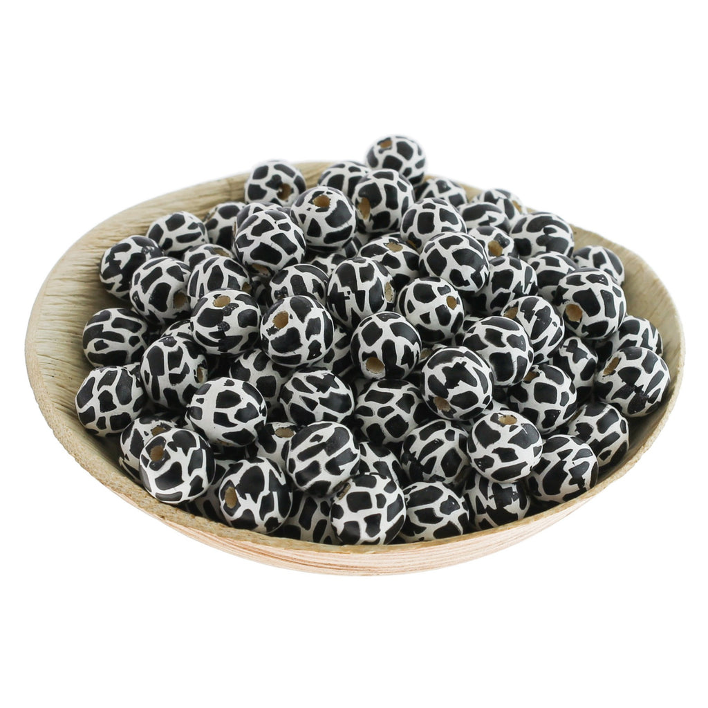 Black and white cow print beads in a 10mm round, with a polished finish.