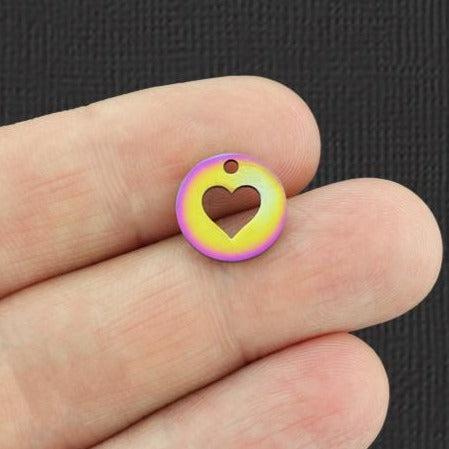 Round disc with heart cut out electroplated rainbow stainless steel charms.