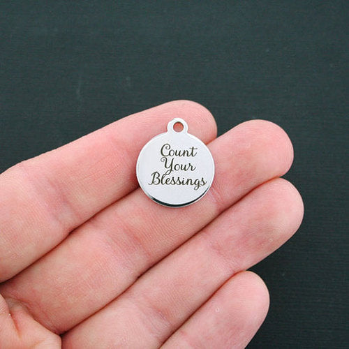 Breloques rondes en acier inoxydable gravées au laser "Count Your Blessings", de notre ligne exclusive conçue par Bohemian Findings.