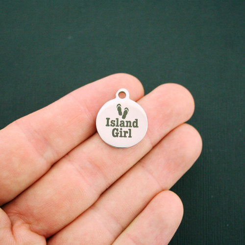 Breloques rondes en acier inoxydable gravées au laser "Island Girl" avec image de tongs, de notre ligne exclusive conçue par Bohemian Findings.