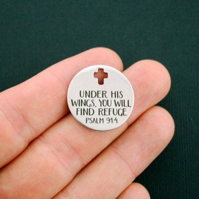 "Sous ses ailes, vous trouverez refuge. Psaume 91:4" charms ronds découpés en croix en acier inoxydable gravés au laser, de notre ligne exclusive conçue par Bohemian Findings.
