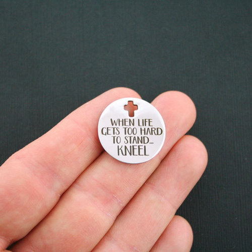 Breloques rondes découpées en croix en acier inoxydable gravées au laser "Quand la vie devient trop difficile à supporter... s'agenouiller", de notre ligne exclusive conçue par Bohemian Findings.