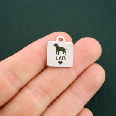 Breloques carrées en acier inoxydable gravées au laser "Lab" avec image de cœur et de chien, de notre ligne exclusive conçue par Bohemian Findings.