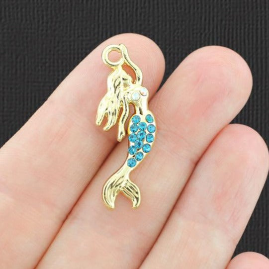 Breloques sirène dorées avec strass bleus incrustés, dans un alliage de zinc. Parfait pour les bracelets, pendentifs, boucles d'oreilles, tirettes de fermeture éclair, signets et porte-clés !