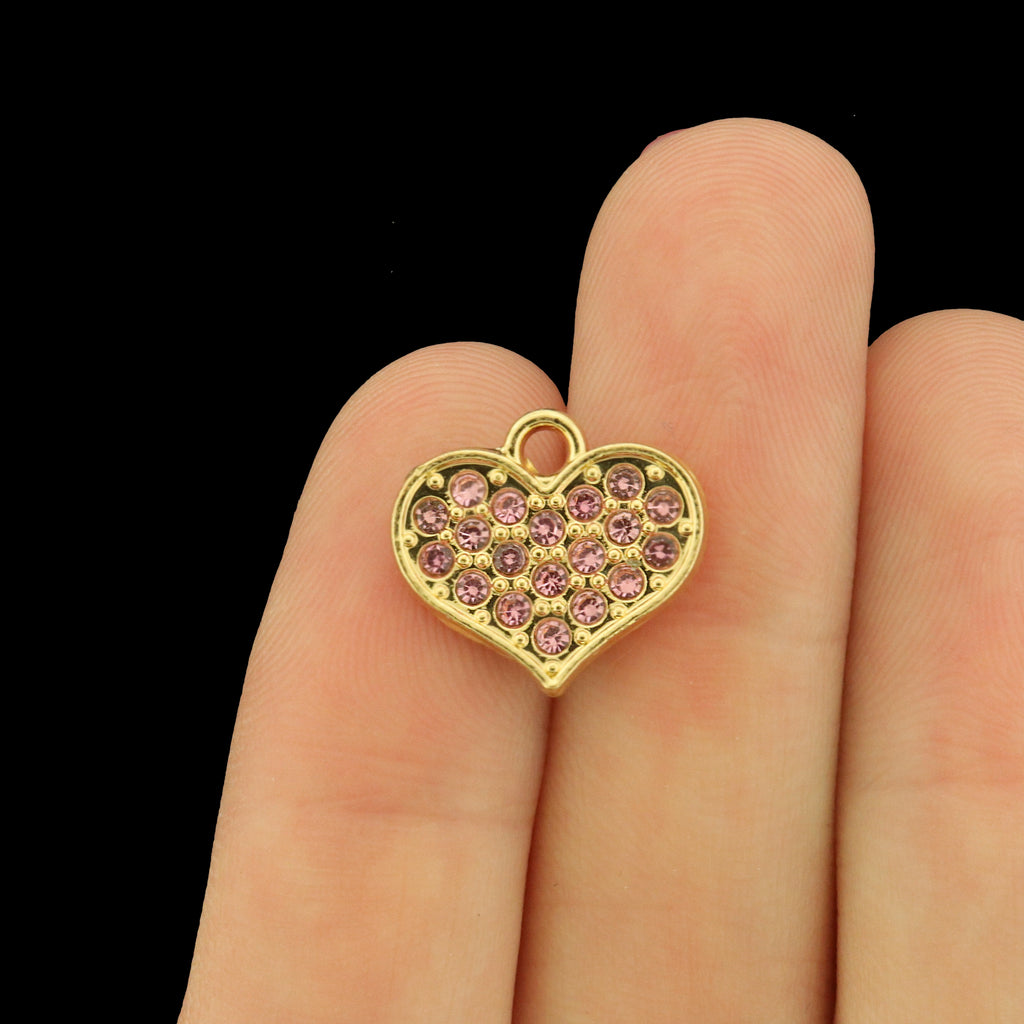 Super eye catching small gold heart charms with colorful rhinestone! Choose from red or pink rhinestones.