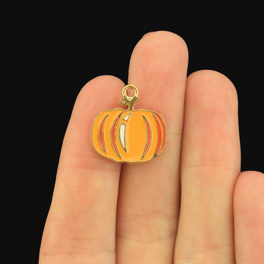Take a look at these pumpkin charms. They are made of gold tone zinc alloy and finished with orange, white, and brown enamel.