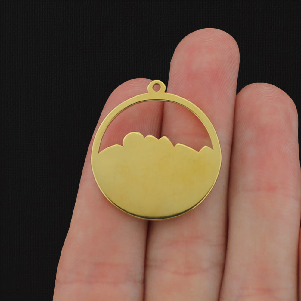Round mountain range forest scene cutout gold tone charms, in 304 stainless steel.