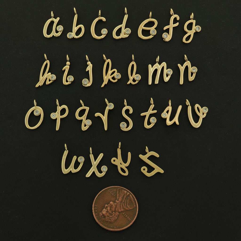 Check out these super dainty cursive style letter charms... with an inset rhinestone. They are made of 14k gold plated brass.