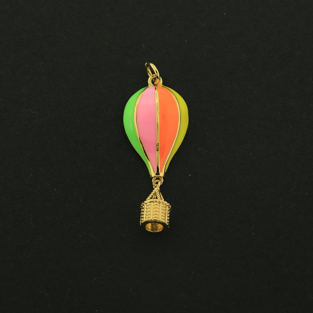 Check out these super detailed hot air balloon charms with green, pink, orange and yellow enamel colors! Includes a swinging 3D dangle basket with an attached jump ring. They are made of 18k gold plated brass.