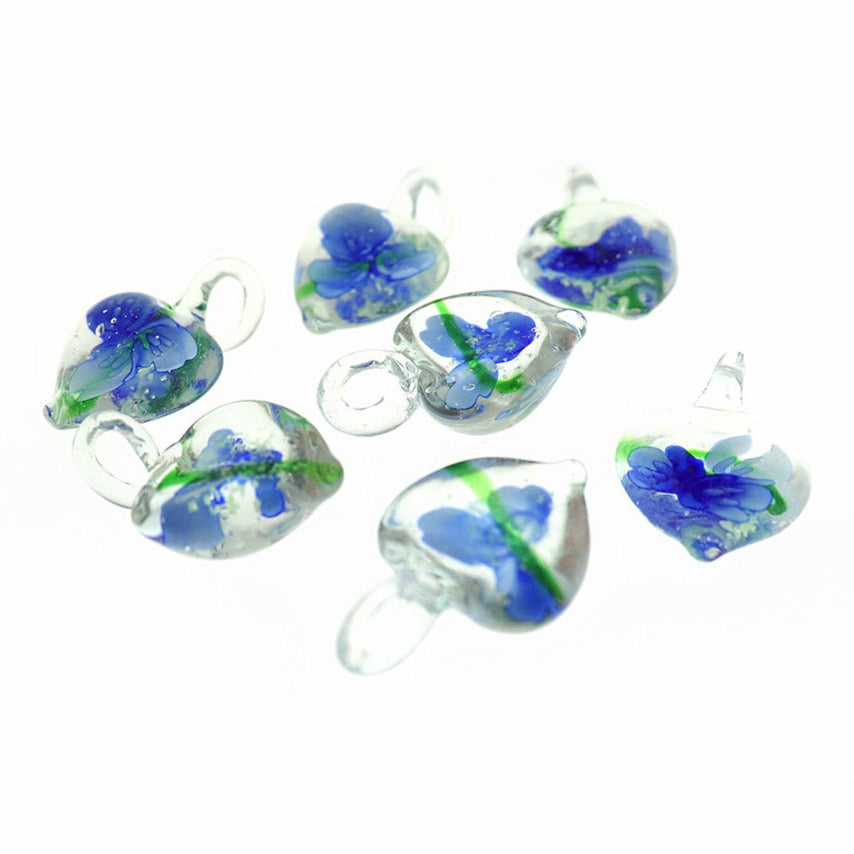 Breloques coeur en verre au chalumeau fleur bleue. Parfait pour les bracelets, pendentifs, boucles d'oreilles, tirettes de fermeture éclair, signets et porte-clés !