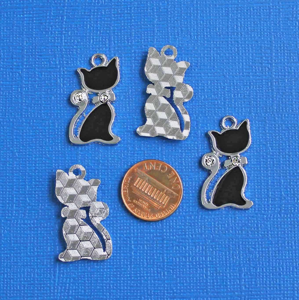 Breloques chat argentées, en alliage de zinc et émail avec strass incrustés. Parfait pour les bracelets, pendentifs, boucles d'oreilles, tirettes de fermeture éclair, signets et porte-clés !