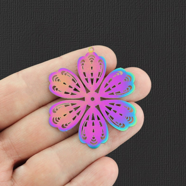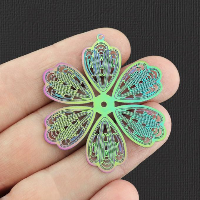 Breloques en acier inoxydable arc-en-ciel électroplaqué fleur en filigrane. Parfait pour les bracelets, pendentifs, boucles d'oreilles, tirettes de fermeture éclair, signets et porte-clés !