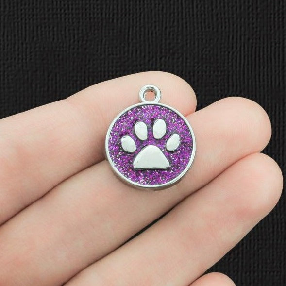 Breloques argentées à empreinte de pattes rondes violettes scintillantes, en émail et alliage de zinc. Parfait pour les bracelets, pendentifs, boucles d'oreilles, tirettes de fermeture éclair, signets et porte-clés !