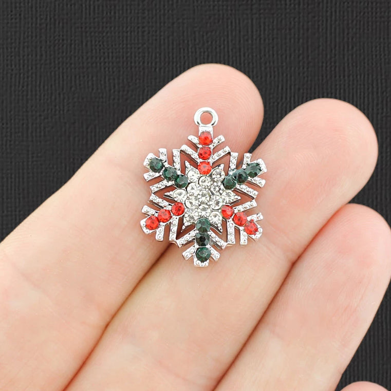 Breloques flocon de neige argentées antiques avec strass rouges, verts et transparents incrustés, dans un métal en alliage de zinc. Parfait pour les bracelets, pendentifs, boucles d'oreilles, tirettes de fermeture éclair, signets et porte-clés !