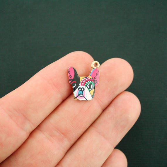 Breloques dorées avec détails abstraits en émail coloré de chien taureau français, dans un métal en alliage de zinc. Parfait pour les bracelets, pendentifs, boucles d'oreilles, tirettes de fermeture éclair, signets et porte-clés !