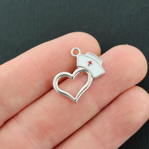 Breloques cœur avec bonnet d'infirmière argentées, en alliage de zinc et émail. Parfait pour les bracelets, pendentifs, boucles d'oreilles, tirettes de fermeture éclair, signets et porte-clés !