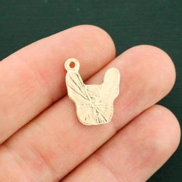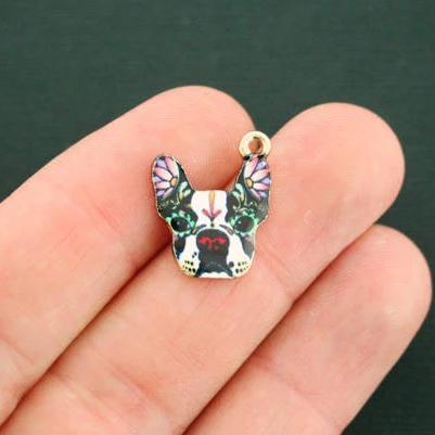 Bouledogue français avec détails de fleurs en émail coloré, breloques dorées, dans un métal en alliage de zinc. Parfait pour les bracelets, pendentifs, boucles d'oreilles, tirettes de fermeture éclair, signets et porte-clés !