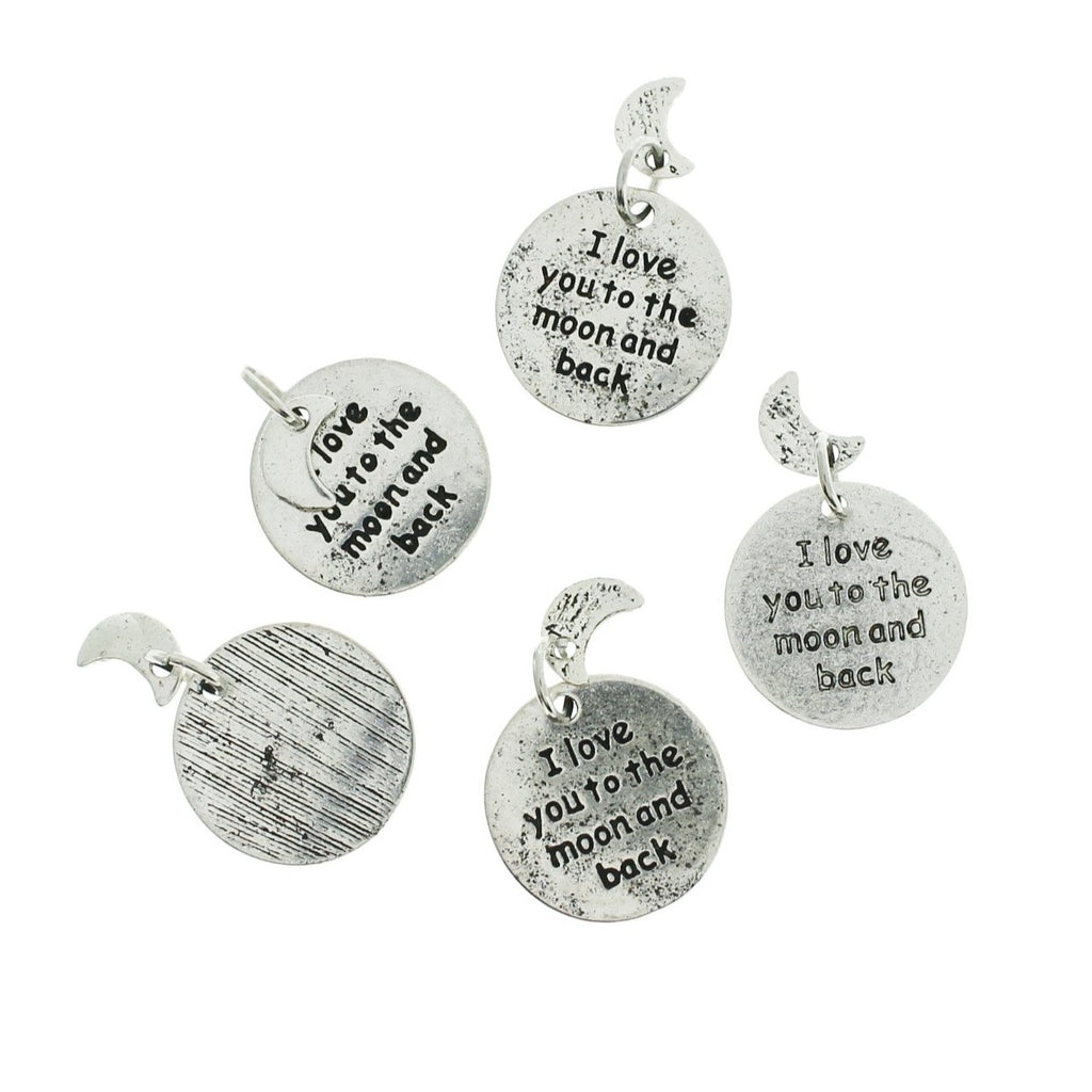 Je t'aime jusqu'à la lune et le dos des breloques argentées antiques, dans un métal en alliage de zinc. Parfait pour les bracelets, pendentifs, boucles d'oreilles, tirettes de fermeture éclair, signets et porte-clés !