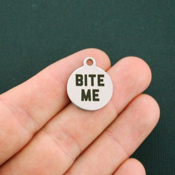 Breloques rondes en acier inoxydable gravées au laser "Bite me", de notre ligne exclusive conçue par Bohemian Findings.