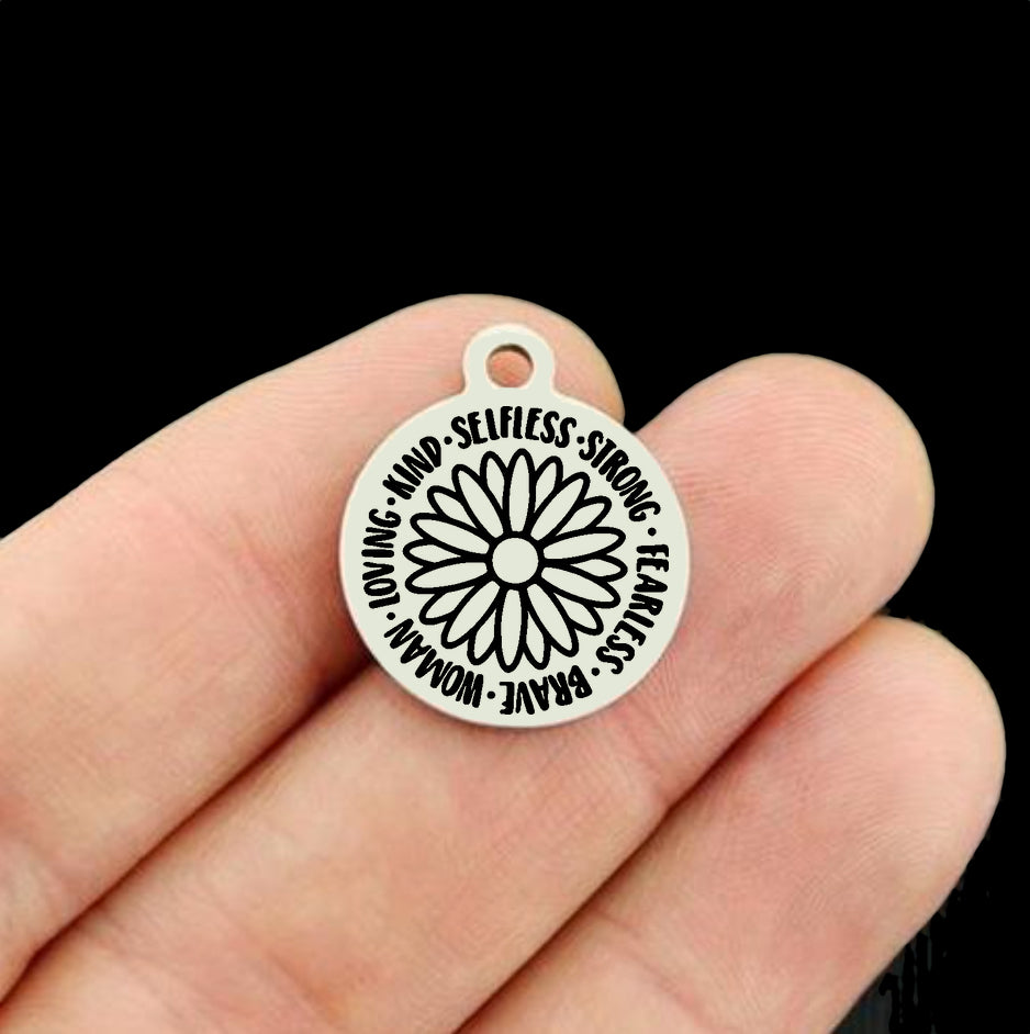 Breloques rondes en acier inoxydable gravées au laser "Je suis assez" , de notre ligne exclusive conçue par Bohemian Findings.