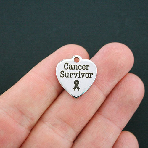 Breloques en acier inoxydable gravées au laser "Cancer Survivor" avec une image de ruban de sensibilisation, de notre ligne exclusive conçue par Bohemian Findings.