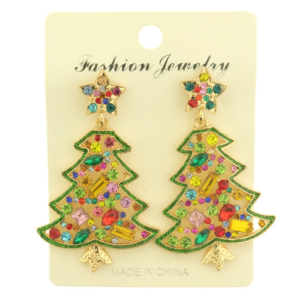 Take a look at these bright Christmas tree earrings... they are made of gold tone metal alloy finished with a bunch of multi color cz rhinestones..