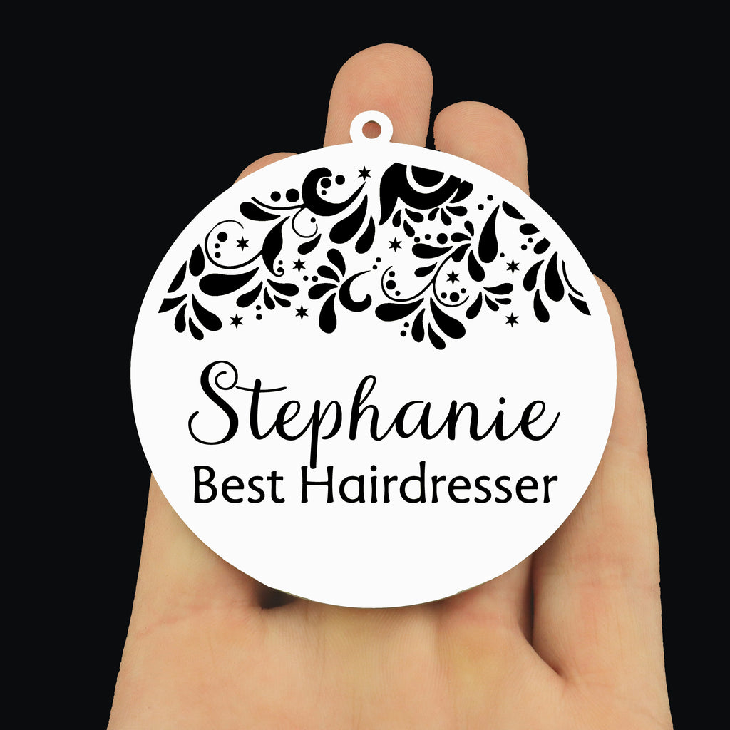 Take a look at these custom stainless steel Christmas ornaments! They are laser engraved with "Best Hairdresser". Just write the name you'd like to appear in the "Name" text box. Each one is custom made.