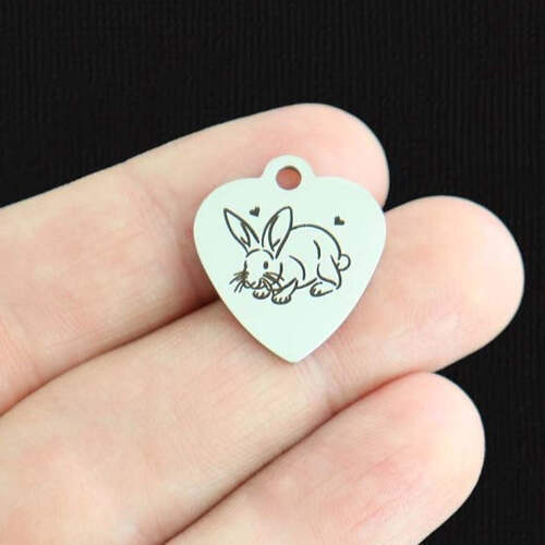 Breloques cœur en acier inoxydable gravées au laser avec images de lapin et de cœur, de notre ligne exclusive conçue par Bohemian Findings.