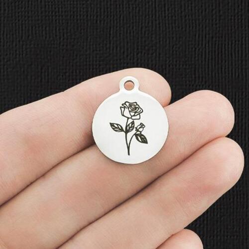Image de fleur de rose de juin, breloques rondes en acier inoxydable gravées au laser, de notre ligne exclusive conçue par Bohemian Findings.