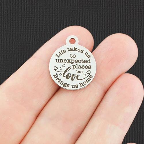 "La vie nous emmène dans des endroits inattendus mais l'amour nous ramène à la maison" Breloques rondes en acier inoxydable gravées au laser avec image de cœur, de notre ligne exclusive conçue par Bohemian Findings.