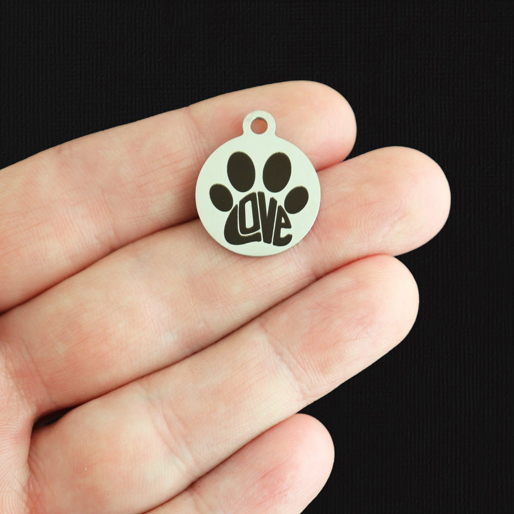 Breloques rondes standard en acier inoxydable gravées au laser avec motif de patte "Love", de notre ligne exclusive conçue par Bohemian Findings.