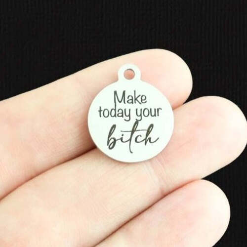 Breloques rondes en acier inoxydable gravées au laser "Make today your bitch" , de notre ligne exclusive conçue par Bohemian Findings.